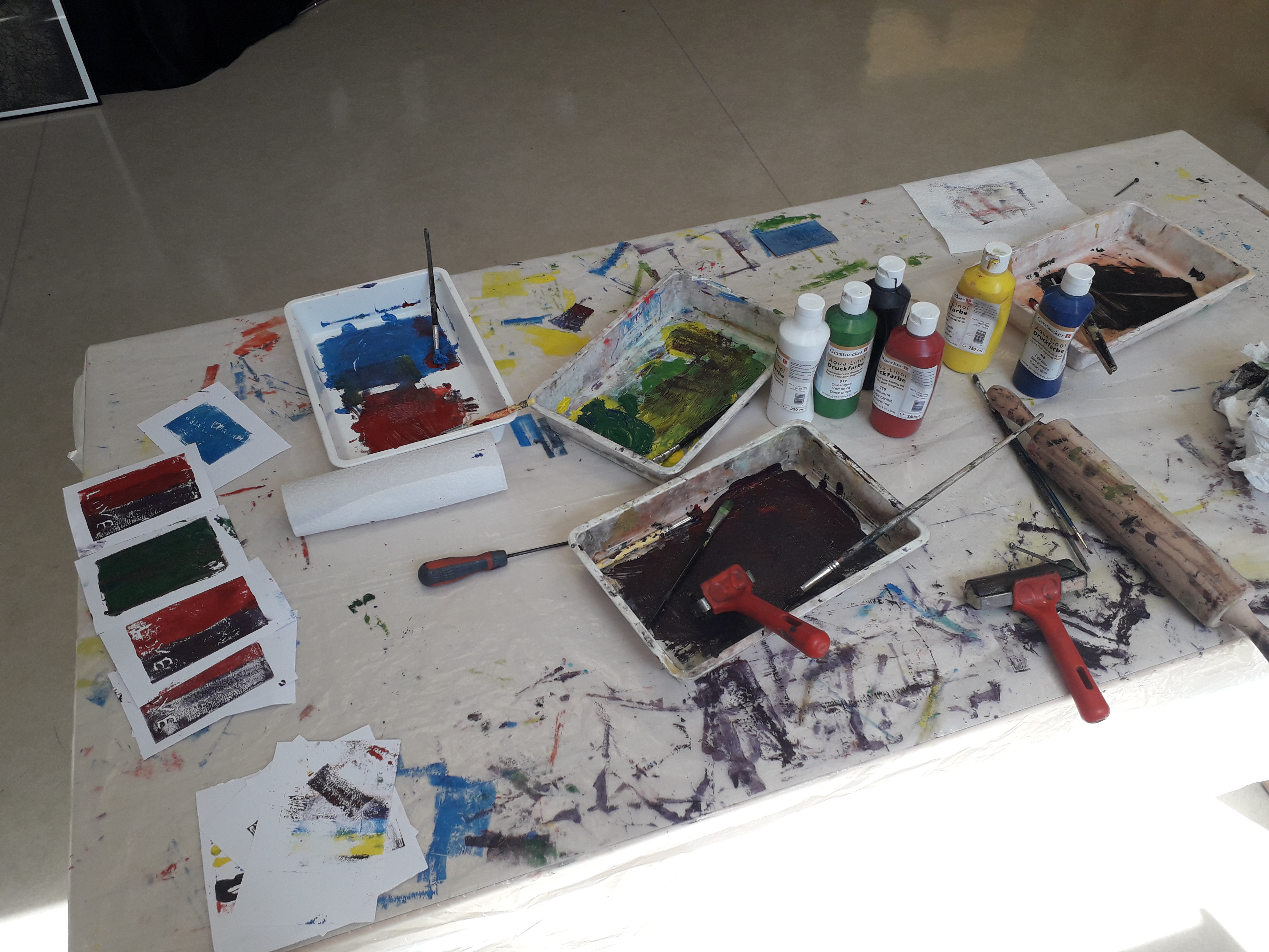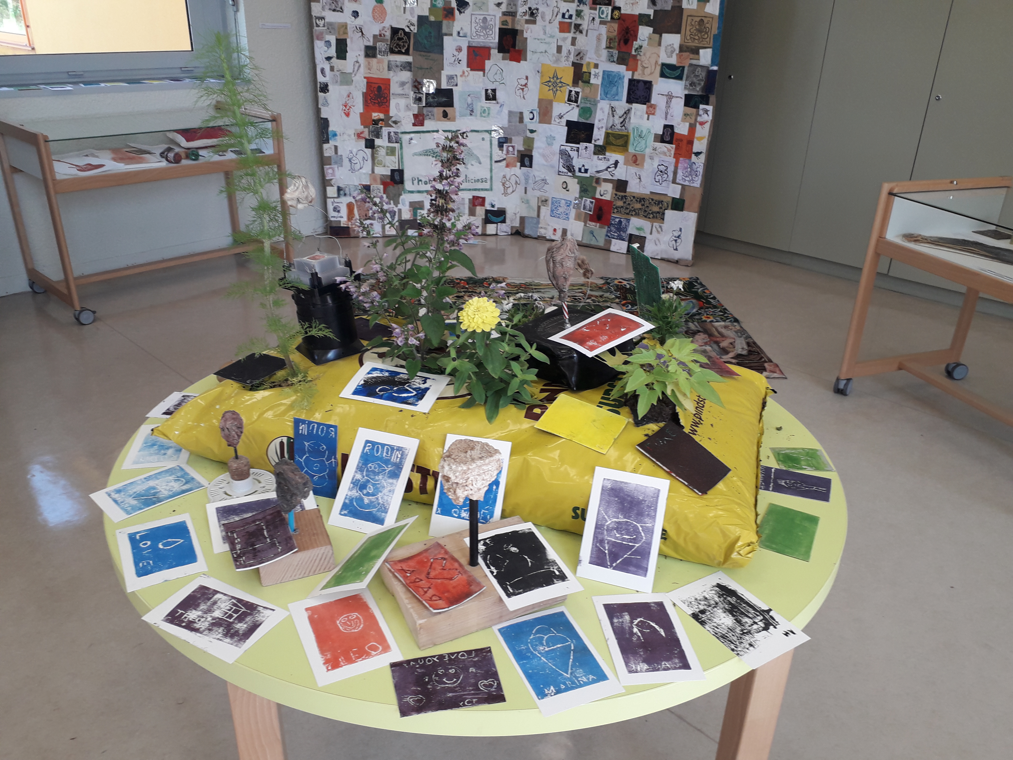 « En fait on est dans ton musée. » Les enfants de l’accueil périscolaire m’ont fait l’honneur de participer à des ateliers de gravure cet après midi au milieu de l’exposition de la médiathèque de Seichamps. Un moment de partage convivial avec des enfants de 6 à 11 ans. Tous se sont prêté à l’exercice d’écrire à l’envers, de gratter leur estampe puis de l’encrer en mélangeant les encres. Chacun a aussi la difficulté de ce travail et certains se sont armés de patience pour arriver à la plus belle impression. D’autres ont préféré se plonger dans la contemplation des œuvres environnantes, avec des réflexions tantôt piquantes, tantôt touchantes. J’espère les retrouver en septembre pour perfectionné leur technique! Je vous laisse admirer leurs œuvres, vous retrouverez des photos des enfants en activité sur le site de l’accueil jeune et dans l’est républicain.