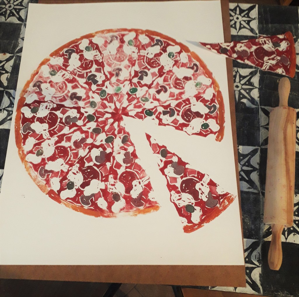 Ceux qui me connaissent savent que la pizza c’est important pour moi. Pour les autres je vous invite à venir en manger une à la maison à l’occasion. Ce samedi pourquoi pas, en sortant de l’expo. Il y en aura, au moins en linogravure! Une composition d’ingrédients choisis, les couleurs qui se mélangent, un geste patient et répété, la petite touche personnelle… La cuisine et la lino ont pas mal de choses en commun. Tant mieux j’aime les deux!