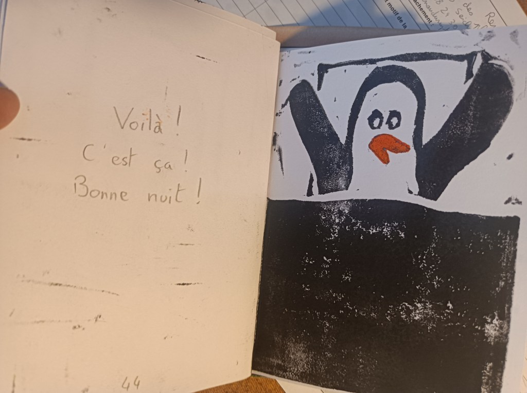 Bonjour à tous, amis insomniaques et pingouins notoires. Voici le premier jet de mon dernier opus. Entièrement en lino, l’impression est faite maison. Il a bien besoin de quelques retouches mais je vous le livre tel quel, parce que quoi de mieux que des insomniaques pour rendre cet ouvrage moins soporifique? Allez, vous avez une semaine. Une page dédicacée offerte par bonne idée!