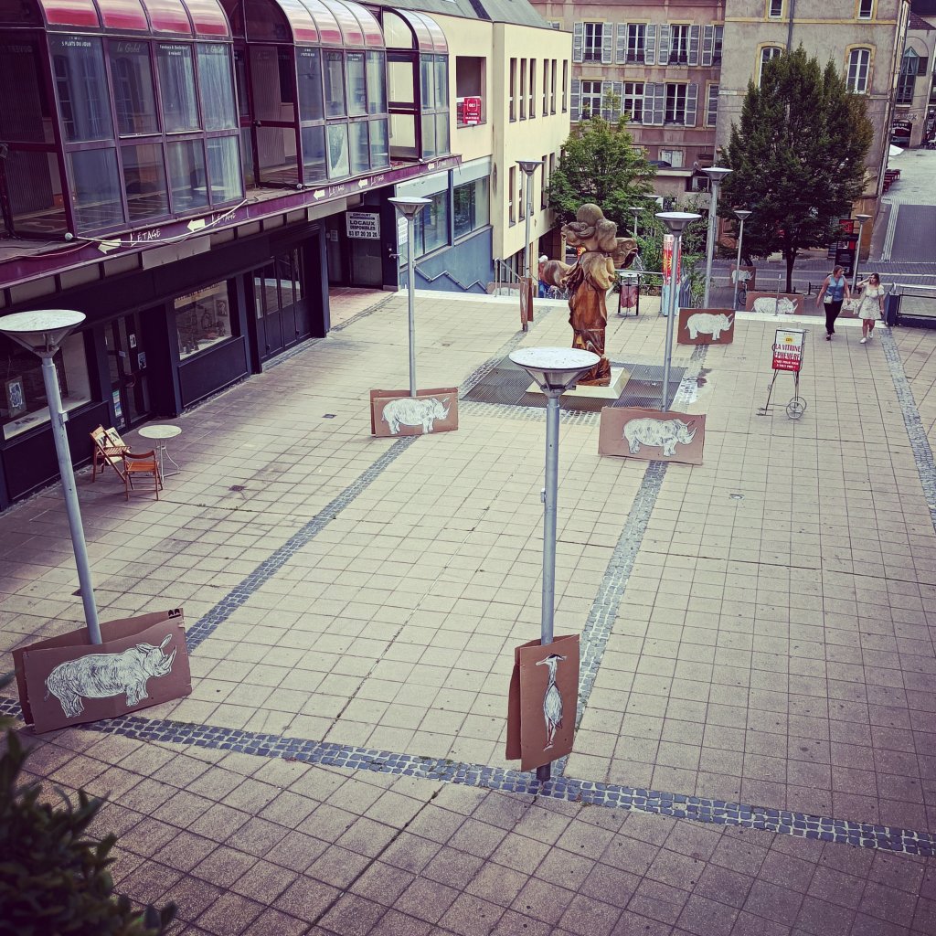 À l’occasion du salon littéraire » Autour du livre » de Seichamps, ce qu’il reste de mon troupeau de Rhinocéros ornera le hall du centre socioculturel de la ville. Rendez vous dimanche à partir de 10h à tous les amateurs de littérature et de Linogravure. L’atelier est à deux pas pour ceux qui voudraient en savoir plus. Pour les enfants, un rhino sera gribouillable et pour les adultes quelques extraits du « Rhinocéros » de Ionesco vous donneront j’espère envie de le relire, ou au moins matière à réflexion. Des vingt Rhinocéros de Metz, il n’en reste qu’une petite dizaine. Pensez à réserver le votre!