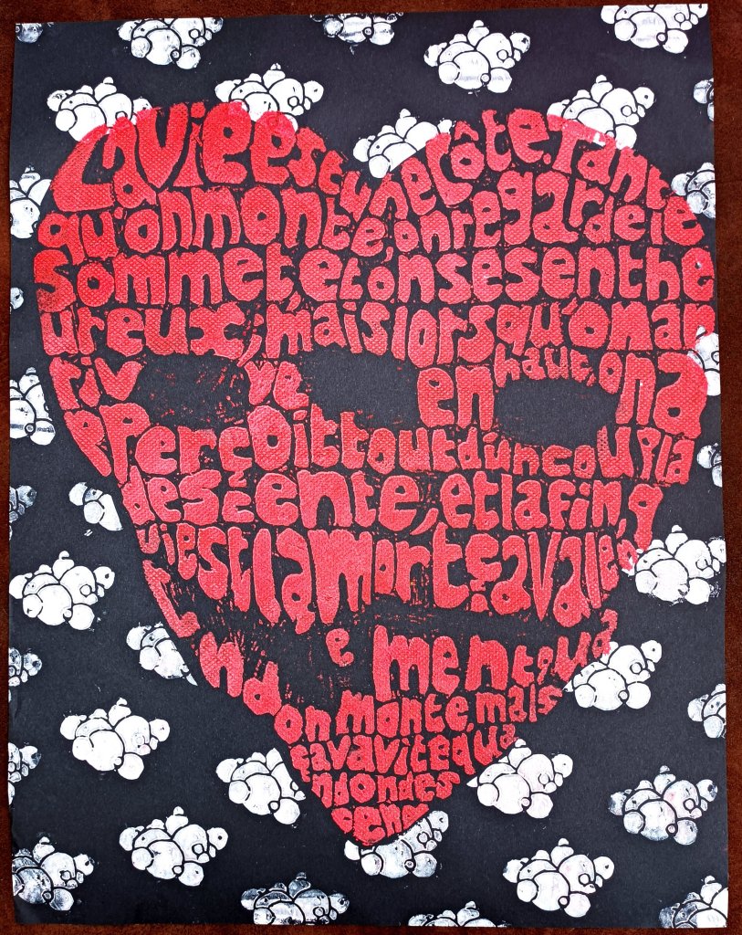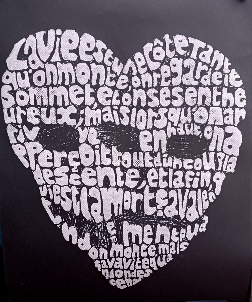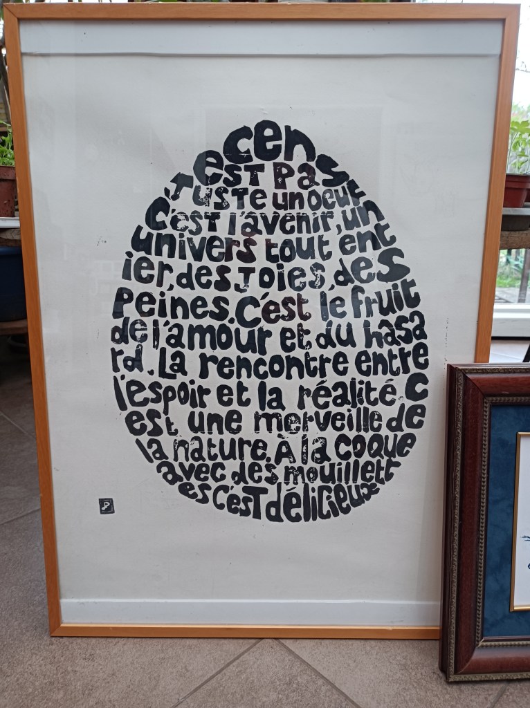 Le lettrage rappelle un peu les tracts et les affiches de mai 68. Pour la prochaine manifestation, n’hésitez pas à me solliciter du coup. Il se trouve que j’ai en ma possession une presse à tracts! Il me reste aussi quelques « oeufs » pour ceux qui ne seraient pas sensibles à la poésie de Guy de.