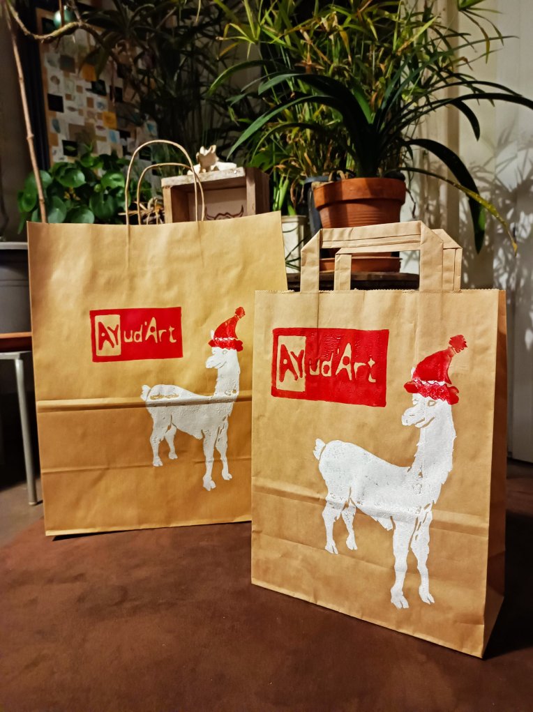En panne d’inspiration pour Noël? Moi non plus c’est pas trop ma spécialité les cadeaux. Les emballages non plus d’habitude. Mais là, c’est pour la bonne cause. Moi j’imprime en Lino sur les sacs Kraft, Ayud’art se charge de les remplir de bonnes choses produites dans la région. Il ne reste qu’à les offrir.
