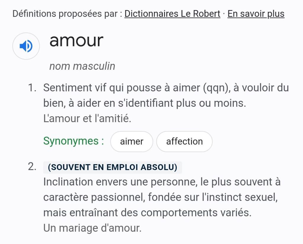 La définition de l’amour est d’ailleurs assez floue, variable, voir aléatoire selon les personnes. Certains se permettent d’ailleurs des actes assez ahurissants en son nom. Des comportements variés nous dit le Robert. Sacré Robert, pas facile à expliquer ce truc, hein?