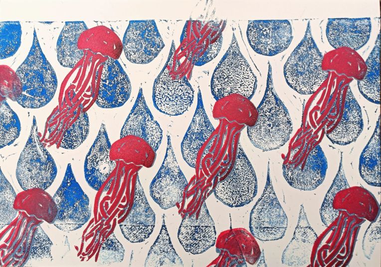 Sur ces considérations , je retourne à mes méduses. La beauté dans toute son élégance, calme, sereine et dangereuse. Et pour ceux qui ont apprécié l' »Arche », je travaille à des formats plus abordables pour les appartements de personnes qui ne partent pas avec la caisse. Cela dit si vous avez des grands murs ouverts au public, les déductions fiscales sont intéressantes ( on parle de 100% , oui, oui, vous ne rêvez pas).